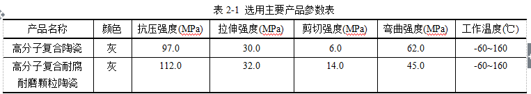 (2)高分子顆粒陶瓷是一種雙組份、填充陶瓷小顆粒、高性能表面涂層材料,主要成分是碳化硅、金屬碳化物和超硬陶瓷,具有良好的耐磨蝕和腐蝕性能,作為耐磨蝕和耐腐蝕保護涂層被廣泛的應用于各種化工設(shè)備及通用設(shè)備。適合應用于灰漿泵、水泵、風機、水輪機蝸殼、凈化煙道、氧化鋁粉輸送管道等內(nèi)壁防腐耐磨局部或大面積修復。